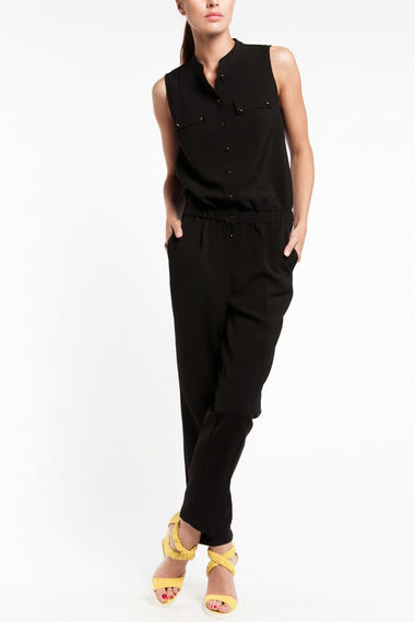 Стильный комбинезон черного цвета! Модель из шелковистой ткани, с длинными штанинами, пояс на резинке, без рукавов, застегивается на пуговицы.